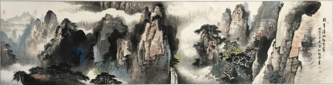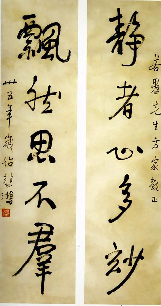 书学方面,徐悲鸿在临摹北碑的基础上又先后摹写了倪元璐、王铎、傅山等人的书法,逐渐形成了自己风骨开张、运笔连贯、笔法俊朗、古拙天真的个人风格。此联是徐氏书法成熟期的代表作。其笔意在行草之间,以中锋用笔,圆润中见方拙,尽显魏碑书法外拓方整的笔法特点,同时又不失明朝王铎等人硬倔的书风笔韵,并在飘逸俊秀中得自然天成之趣。所书内容表达了作者的抗战热忱。