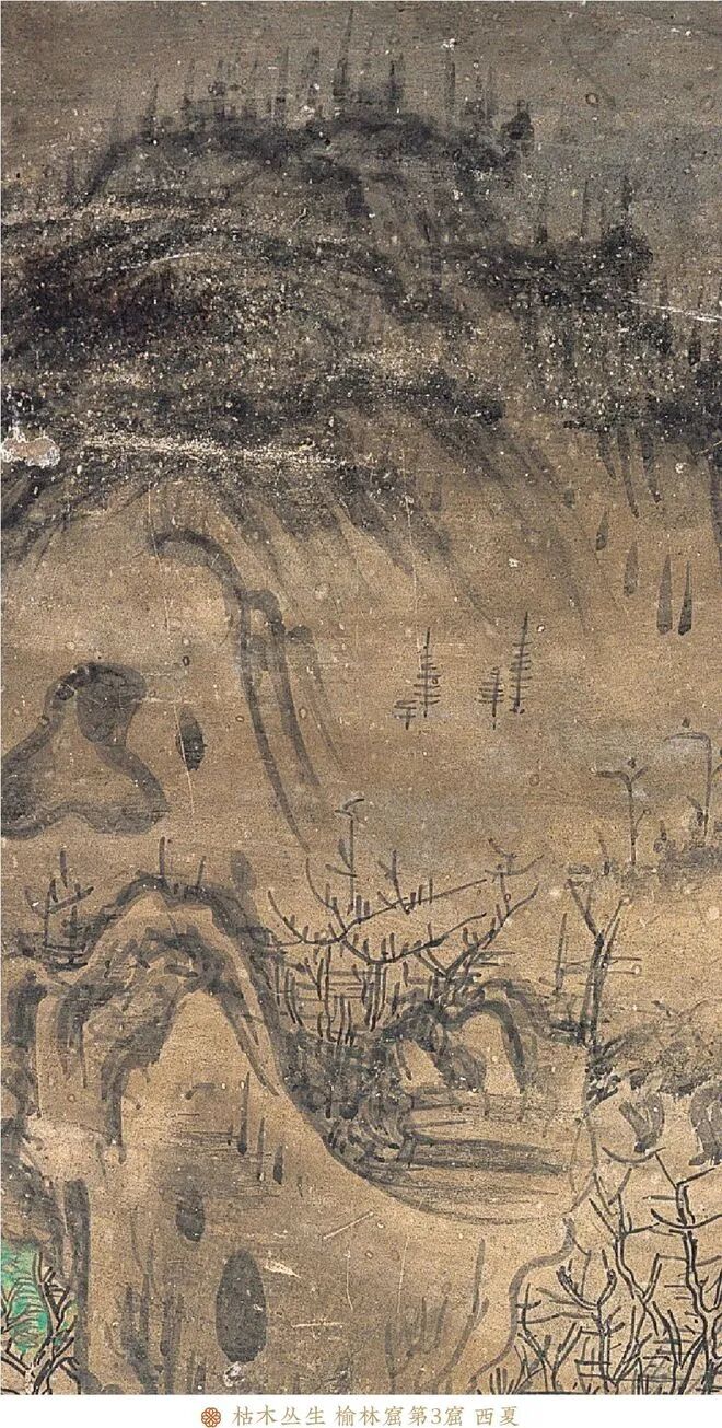 在敦煌榆林窟第3窟的壁画里,丛丛枯木屹立在寒风中,鹿角般的枝桠牵挂着漫散的烟云。天空晦暗不明,点点微雪将落,为来年新岁暗送一场瑞雪的祝福。