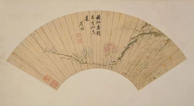 小寒时节,腊梅已开,文人画家多爱赏梅写梅。明代陈继儒 《雪梅图》扇页图绘月光下的梅花,笔墨简约,布景舒朗清新,一片清光静谧之气。