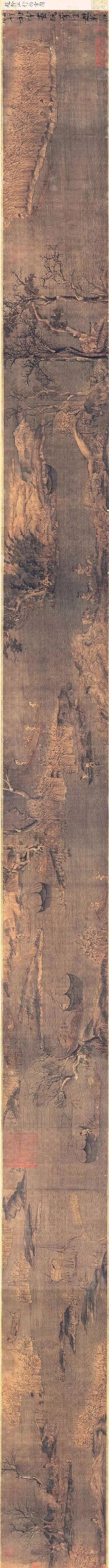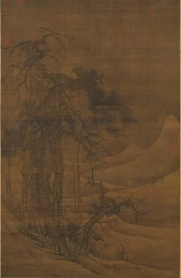 传为宋代郭熙 的《寒林图》中,林木已落叶凋零,仅存如龙爪飞舞般的老干枯枝,与残余点点绿叶的斑驳古柏,挺立在孤孑突兀的坡土上,有种萧瑟严寒的气象。画法上无论画树或山石,用笔都遒劲有力,墨色层层渲染,加重了灰黯的天空,衬白了寒雪,更显得景物萧条荒远。树石略带程式化倾向,有可能是十三世纪之作。