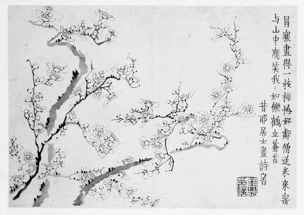 清代扬州八怪的金农《梅花册》第三开(图六)自题:“冒寒画得一枝梅,恰好邻僧送米来。寄与山中应笑我,我如饥鹤立苍苔。昔耶居士画诗书。”钤印“金农印信”。这段写实的诗道出了金农生活的窘态,充满了自嘲和无奈。此诗见之于下文提到的罗聘行书《金农题画诗册》中“冬心先生画梅题记”内。