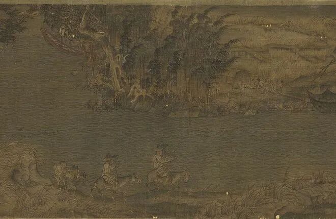 在历代书画中,关于天寒与风雪的名迹更是不胜枚举。如五代赵幹的《江行初雪图》是一幅山水人物并重的绘画作品,也是传世作品中时代很早的一幅天寒时节的绢地山水画。赵幹的《江行初雪图》算是一件。据《宣和画谱》记载,赵幹为江南人,善画山林泉石,曾为南唐后主李煜朝画院学生,所画多为江南风景。
